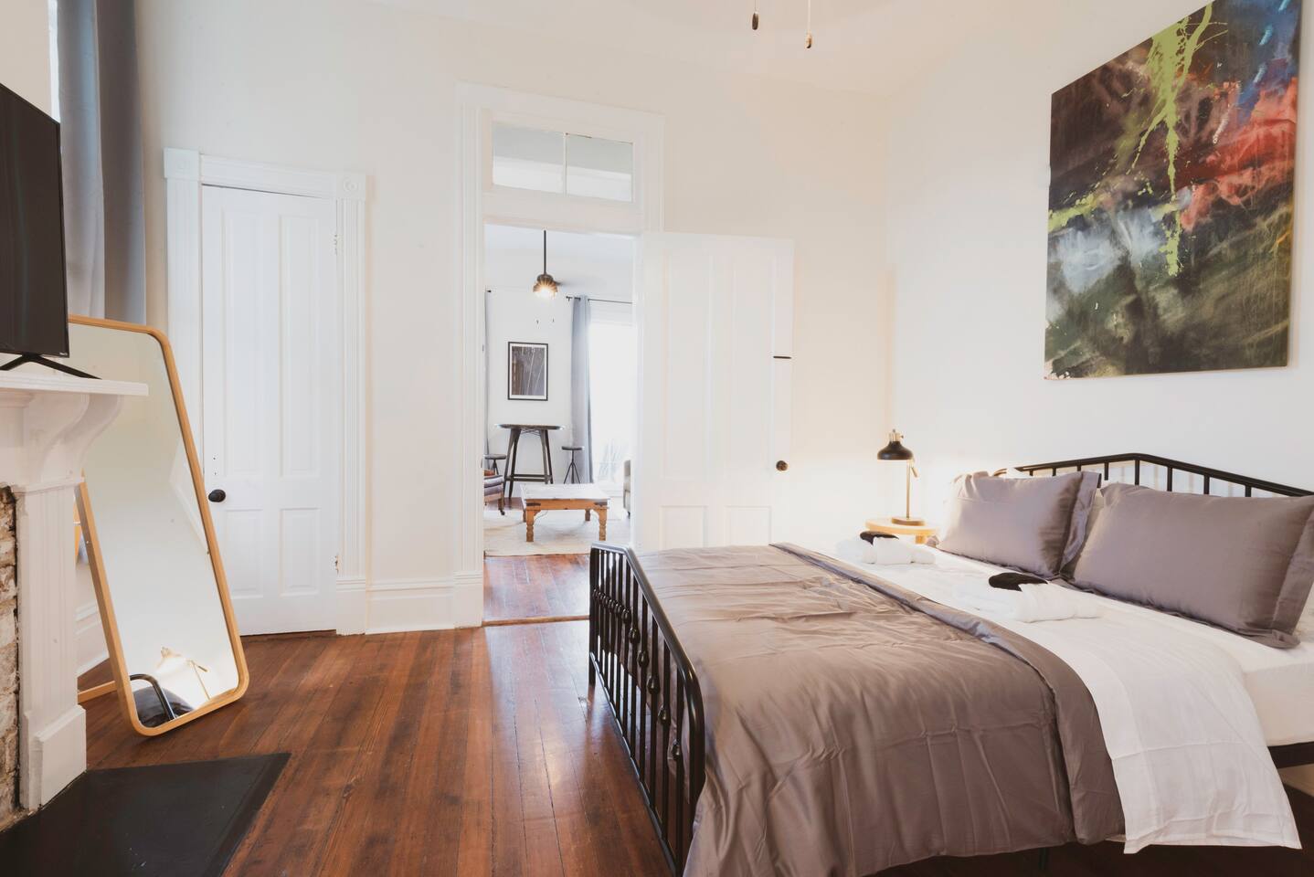 This home is newly furnished and offers plenty of amenities. The interior was designed by SCAD alumni, and the home features original art from the SCAD grads. This private bedroom includes 1 queen bed, a desk/workspace, and a Roku Smart TV. There are 2 full bathrooms, but only one is accessible to this bedroom. The full kitchen is perfect for preparing light meals and includes a stove, oven, a fridge/freezer, microwave, and Keurig. It's stocked with cooking essentials like pots, pans, dishes, glasses, and mugs. The patio offers a gorgeous view, and is a great place to enjoy your morning coffee! Please keep in mind this home is on the top floor of a multi unit building. This listing is a great fit for young couples or travelers who have previous experience booking private bedrooms within a shared space. It’s likely that on busy weekends or popular travel times that you’ll be sharing the home with other Airbnb guests and may interact with them in passing. Each bedroom is listed as its own Airbnb for travelers to book. This is a shared space, and we ask that all of our guests are courteous and respectful. Please note that we cannot be responsible for the behavior of other guests. There is an electronic keypad on the front door for convenient self check-in. Each bedroom also has its own electronic lock for additional peace of mind. Parking: There is free, on-street parking available. This is very common in Savannah - if you decide to stay downtown, you will have a very hard time finding off-street parking. There is usually ample parking available, but it is first come, first served and there are no reserved spaces. We cannot guarantee parking spaces, or enough space for trailers, U-Hauls, boats, etc. Please be advised of weekly street cleaning - there are signs that indicate which day of the week the street cleaning is, and if you happen to stay during street cleaning, you can just park on the opposite side of the street. Quiet Hours: This is a residential neighborhood. Please be advised that we ask all guests to respect 10PM quiet hours every night of the week. Any violations may result in a formal report on Airbnb or an early termination of your reservation. Any unapproved late checkouts may result in additional fees. There is a $50 shipping fee for any items that you leave behind and need shipped back to you. You're within walking distance to historic downtown and many Savannah staples, including Fox & Fig, Hitch, Peregrin, and J. Christopher's. Spend the day exploring SCAD buildings, beautiful Savannah squares, or take a tour of the Cathedral, all without a car. A quick 6 minute Uber ride to River Street and about a 25 minute drive to Tybee Island! I’d recommend this home to anyone looking to come to Savannah to have a great time and experience the city as locally and authentically as possible! If a residential neighborhood filled with art students and families of folks who look differently than you will make you uncomfortable, then I’d recommend a hotel. If things like dust on blinds, leaves on the patio, or scuffs on the stairs are what will determine whether or not you enjoy your stay, I’d also recommend a hotel. It just depends on what you’re looking for as a visitor, and if you’re unsure about what may be the most suitable for you and your needs, we're happy to chat with you at any point to help you determine that! STVR Permit #02197