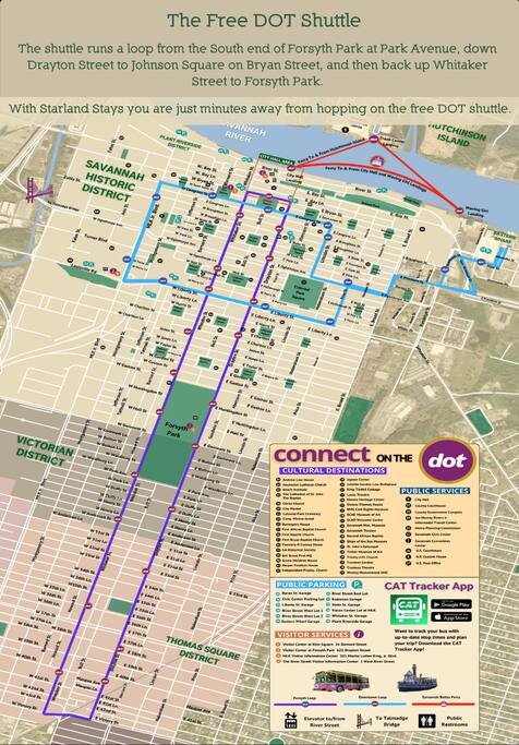 With a walk score of 92% and a bike score of 87%, meaning the area is very walkable and bike-able, downtown Savannah is truly a walking city. Bring comfy shoes! It's totally possible—and incredibly fascinating—to spend days strolling through Savannah’s historic neighborhoods, including the nation's largest Landmark Historic District. ✔ WALK/BIKE SCORE - The Starland Arts District has a walk and bike score of 84%, making it one of downtown Savannah’s most walkable neighborhoods! ✔ BIKE RENTALS - Savannah is a Bronze Level Bicycle-Friendly Community as awarded by the League of American Bicyclists. If getting around on two wheels is your style, Sekka on Broughton St offers hourly and daily bike rentals, and Savannah On Wheels offers both bike rentals and bike tours. ✔ FREE TROLLEY - The DOT shuttle is a fare-free trolley service to help visitors and residents get around downtown Savannah. This free shuttle service runs every 10 minutes, with free Wi-Fi, and "hop on/hop off" service at any of 33 stops around the Historic District placing you within easy walking distance of more than 45 cultural attractions, local museums, and many popular shops, restaurants, and pubs. The nearest trolley stop is on Whitaker Street - just 2-blocks away! ✹ The Forsyth loop runs from East Victory Drive, north on Drayton Street, to Johnson Square on Bryan Street, and then south on Whitaker Street to West Victory Drive. ✹ The Downtown loop runs from East Liberty Street, north on Price Street - to Eastern Wharf – then north on Lincoln Street, to Congress Street, and south on MLK Jr. Blvd to West Liberty Street. ✔ UBER – There are plenty ride/share options too! It's quick and easy to catch an Uber or Lyft throughout the city. You can even schedule a pick-up time at the airport with Uber Reserve! ✔ PARKING - If you prefer to see the sites in the comfort of your own car there are 10 public parking garages throughout the Historic District, and of course, this neighborhood offers convenient and free on street parking should you rather explore the city on foot.