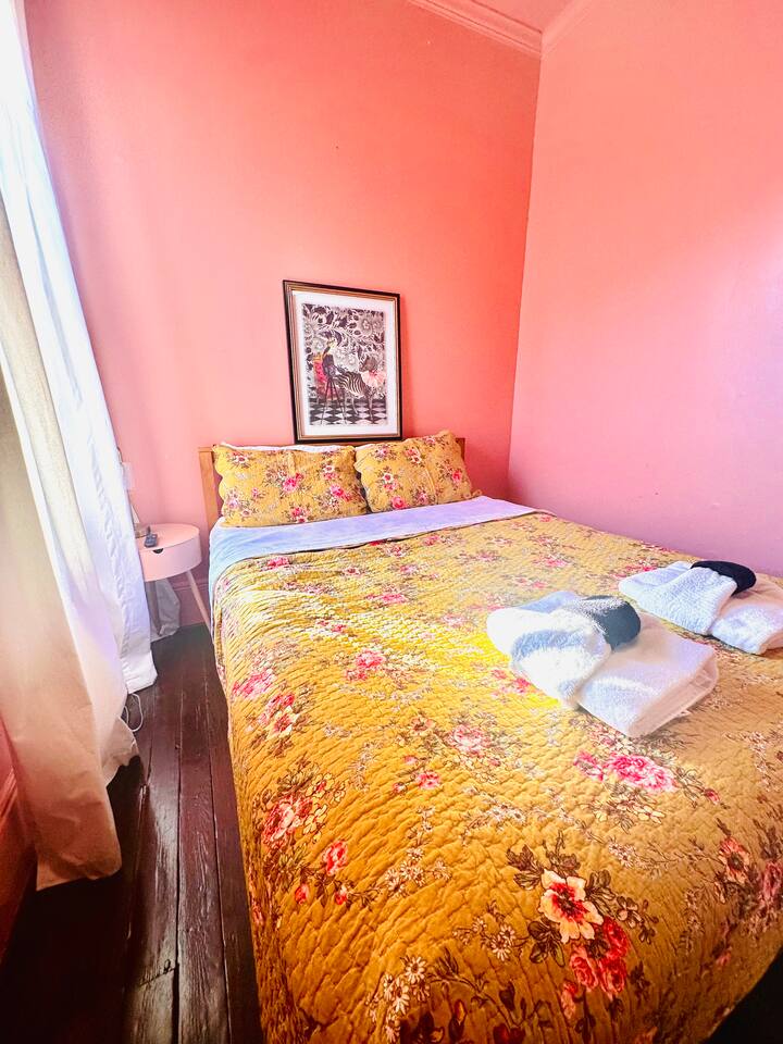 💫 We go beyond the property at this property; we create an experience - Stay like a guest, enjoy like a local! Location is everything at the "Vintage Vicky est 1900" - your new home away from home just landed you in the midst of Savannah's newest Victorian Hotspots! ★★ WALK TO SAVANNAH’S NEWEST HOTSPOTS ★★ Walkable Days. Local Bites. Savannah Nights. One of the best parts of staying here? You’re 1–3 blocks from some of Savannah’s newest and most talked-about local spots—no car needed. • Bobby’s Historic Diner (2 blocks) – A nostalgic Savannah classic serving comfort food with vintage charm. • Shuk (2 blocks) – A vibrant neighborhood favorite featuring craft coffee, an open-air bar, and Mediterranean cuisine. • Trailor Park’s Pizza Party (2 blocks) – Retro vibes, arcade games, and some of the best pizza in the Victorian District—don’t miss the legendary adult Hot Pockets. • Sly’s – A short walk away for cocktails and late-night bites. • Tacos & Tequila – Just steps away for bold flavors and margaritas. • The Collins Quarter at Forsyth Park – A short, insta-worthy walk for brunch, coffee, and iconic park views. This unbeatable location makes it easy to eat, drink, explore, and experience Savannah like a local—all on foot. The space - The Vintage Vicky - est 1900 is a timeless duplex, and this is your chance to experience its charm without needing the entire home! ☆☆ HIGHLIGHTS ☆☆ ✹ Private, 2nd floor apartment in 2-story duplex ✹ 2 Bedrooms w/ queen beds ✹ Living Room w/ Hollywood style sofa (sleeps 1) ✹ High ceilings + original wood floors ✹ Full bathroom; essential toiletries provided ✹ Full kitchen w/ modern appliances ✹ Keurig coffee maker + complimentary K-cups ✹ 3 Flat-screen Roku smart TVs w/ Netflix ✹ High-speed Wi-Fi w/ speeds up to 175+ Mbps ✹ Ring camera at front door + electronic locks ✹ Laundry Room w/ full-size washer and dryer + laundry pods + iron ✹ Family-friendly; Pack ‘n Play + highchair available on request ✹ Dog-friendly (please no cats); pet fee applies ✹ Free on-street parking (first come, first serve) ✹ Short walk to local restaurants; easy walk or drive to markets ✹ Free DOT shuttle just blocks away Eager to Read More? Here Are A Few Kind Words from Our Previous Guests: “Beautiful space! Loved the color, art + decor! Walkable to many restaurants. Very clean. We loved our stay!” –Jennie “Loved staying at this Airbnb! Super close to everything you’d want to do in Savannah! The host is very responsive and even let us check-in early! Really enjoyed our visit and would recommend!” –Courtney “SUCH a cute place!! The decor is incredible, and the furniture was so comfortable and inviting! We loved being able to have coffee (with cream and sugar!) during our stay so that was a great touch! The place had ample street parking and was in a great location. We were able to walk/Uber to places we wanted to go during our stay with ease. Communication was prompt and accessible! Would absolutely stay again or recommend!” - Madeline ☆☆ YOUR HOME AWAY FROM HOME ☆☆ This recently renovated and eclectically furnished private apartment is on the 2nd floor of a 2-story, Victorian-era duplex, in the heart of Savannah’s very walkable Victorian District. Enjoy the convenience of being steps away from SCAD’s Anderson Hall, a short 10-minute walk to Forsyth Park, and many popular restaurants. Live like a local and take a stroll beneath the Spanish moss and grab an amazing brunch at The Collins Quarter Cafe, tour SCAD, or visit the Saturday morning Forsyth farmer's market! ★★ BEDROOMS ★★ Both bedrooms are thoughtfully designed to accommodate weekend getaways with your besties, vacationing families, and traveling remote workers alike. The spacious, primary bedroom has a private, dedicated workspace in the adjoining den for those guests who need to get some remote work done during their stay. The adorable, and very pink, second bedroom is a cozy space. The velvet daybed in the living room sleeps one to accommodate a 4th guest. ✹ Primary bedroom w/ private, adjoining office; Queen size bed + 12” Zinus Green Tea memory foam mattress + dedicated workspace w/ chair + decorative fireplace feature + rattan lounge chair + rattan stools + wall mirror + closet + Roku TV ✹ Second bedroom: Queen size bed + 12” memory foam mattress + storage cabinet + Roku TV ✹ Living area: Twin-size, velvet daybed (sleeps 1) ✔ Premium, 400 thread count sheets ✔ Extra pillows and blankets ✔ Room-darkening curtains ✔ Flat screen Roku smart TVs w/ Netflix ✔ Pack-n-Play (Upon request) ★★ BATHROOM ★★ The recently renovated bathroom has chic modern amenities like a walk-in shower w/ 10” rain-head and adjustable hand-shower, designer tile, luxury fixtures, and an adorable, custom, single handle pink lavatory sink. Enjoy complimentary toiletries, helping you save vital luggage space for your favorite belongings and all-important souvenirs. ✔ Walk-in shower w/ 10” rain-head + adjustable hand shower ✔ Essential toiletries provided (shampoo + conditioner + body wash) ✔ Hair dryer ✔ Fresh towels ★★ KITCHEN & DINING ★★ The updated kitchen combines an endearing 20th-century aesthetic with all the modern appliances you’d expect, such as a full-size fridge, microwave, and gas stove. Home chefs will delight to find we’ve provided all the essential cookware you might need, within easy arm’s reach. This home does not have a formal dining area but there is a dining table for 2 in the living room. ✔ Full kitchen equipped w/ modern appliances + gas stove ✔ Keurig coffee maker + complimentary coffee pods ✔ Essential cookware + dinnerware (including kid-friendly tableware) ✔ Highchair for kids (upon request) ✔ Dining table in living room (seats 2) ★★ LIVING ROOM ★★ The main living area of this bohemian chic, apartment achieves a “vintage-mod